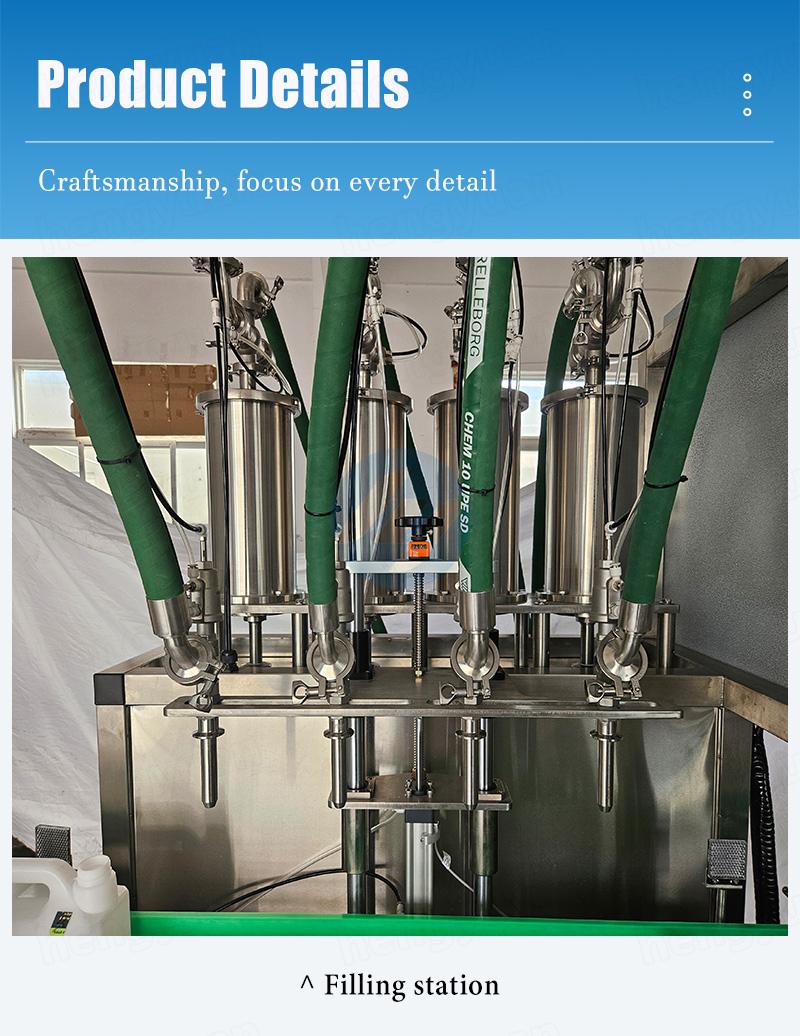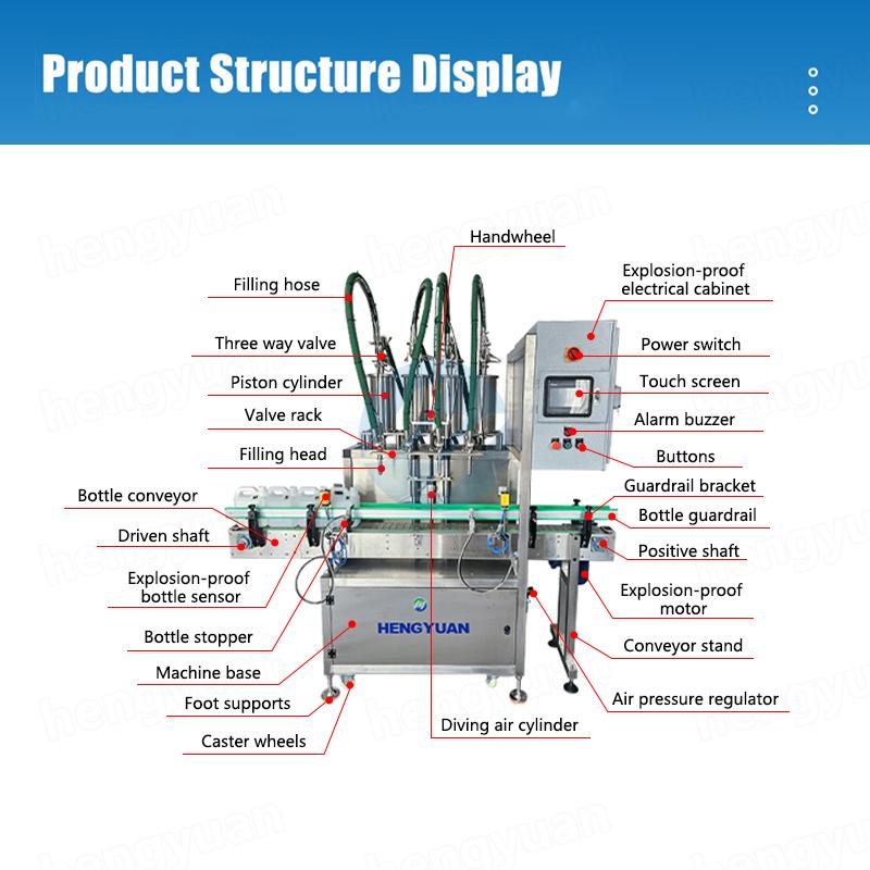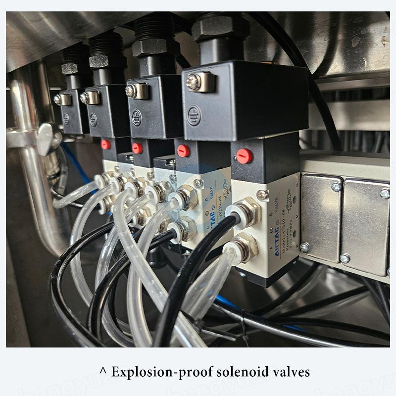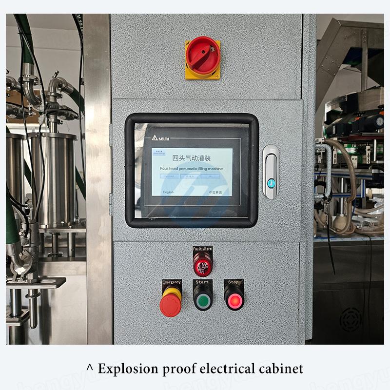 1.Explosion-Proof Design – Certified components (electrical cabinet, sensors, motor, valves) ensure safety in hazardous environments.2.Pneumatic Piston Filling – Ensures high accuracy (±0.5%) with minimal dripping.