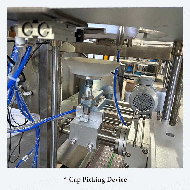 Features an automated pneumatic system for precise picking and placing of lids, ensuring gentle and accurate operation.