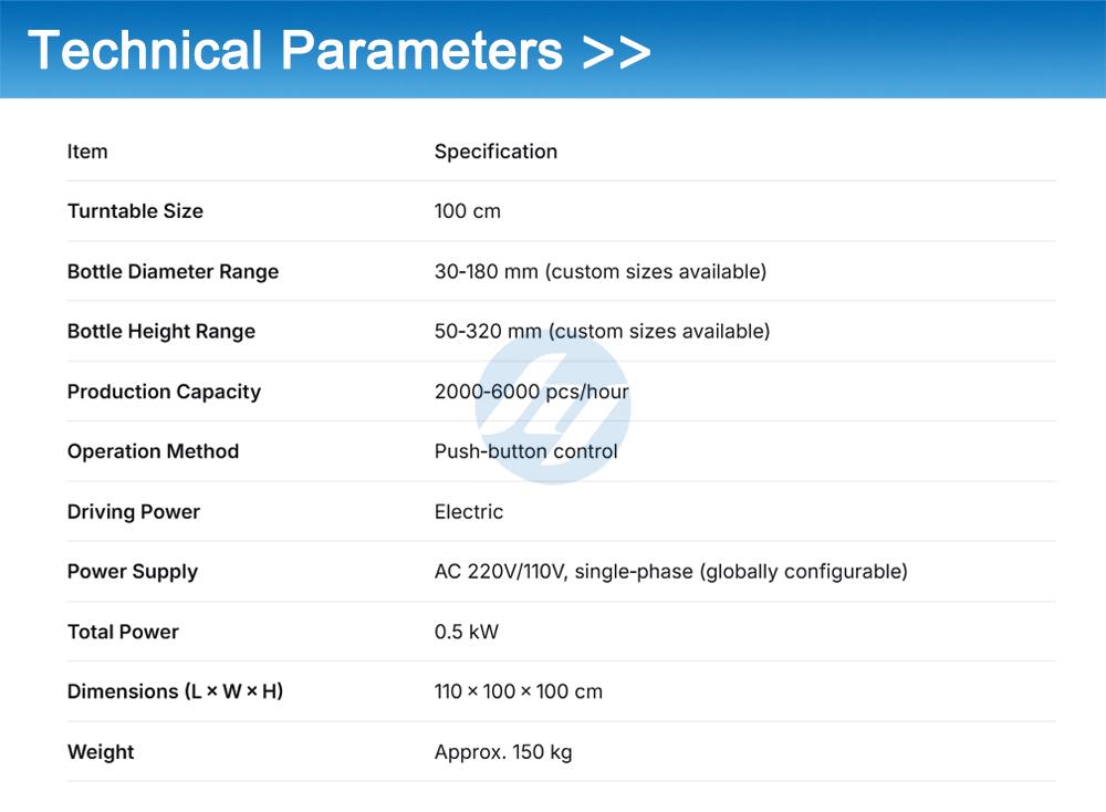 Suitable for agrochemical, cosmetic, pharmaceutical, and food industries, this turntable machine offers reliable and efficient product collection in automated plastic bottle packaging lines.