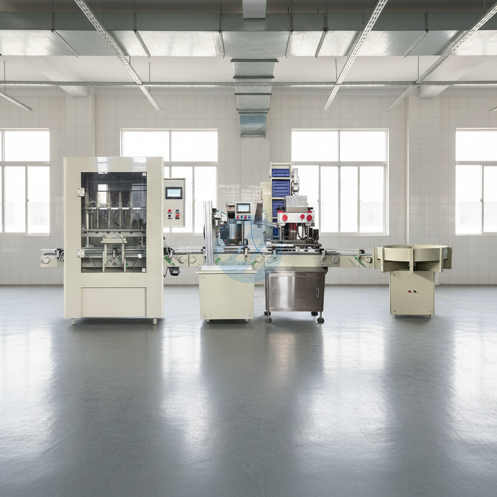 The complete line integrates multiple machines, including a bottle plugger, automatic screw-on capper, and bottle collection turntable, ensuring seamless and efficient packaging. It is primarily designed for bottling free-flowing chemical products with aggressive or corrosive properties.